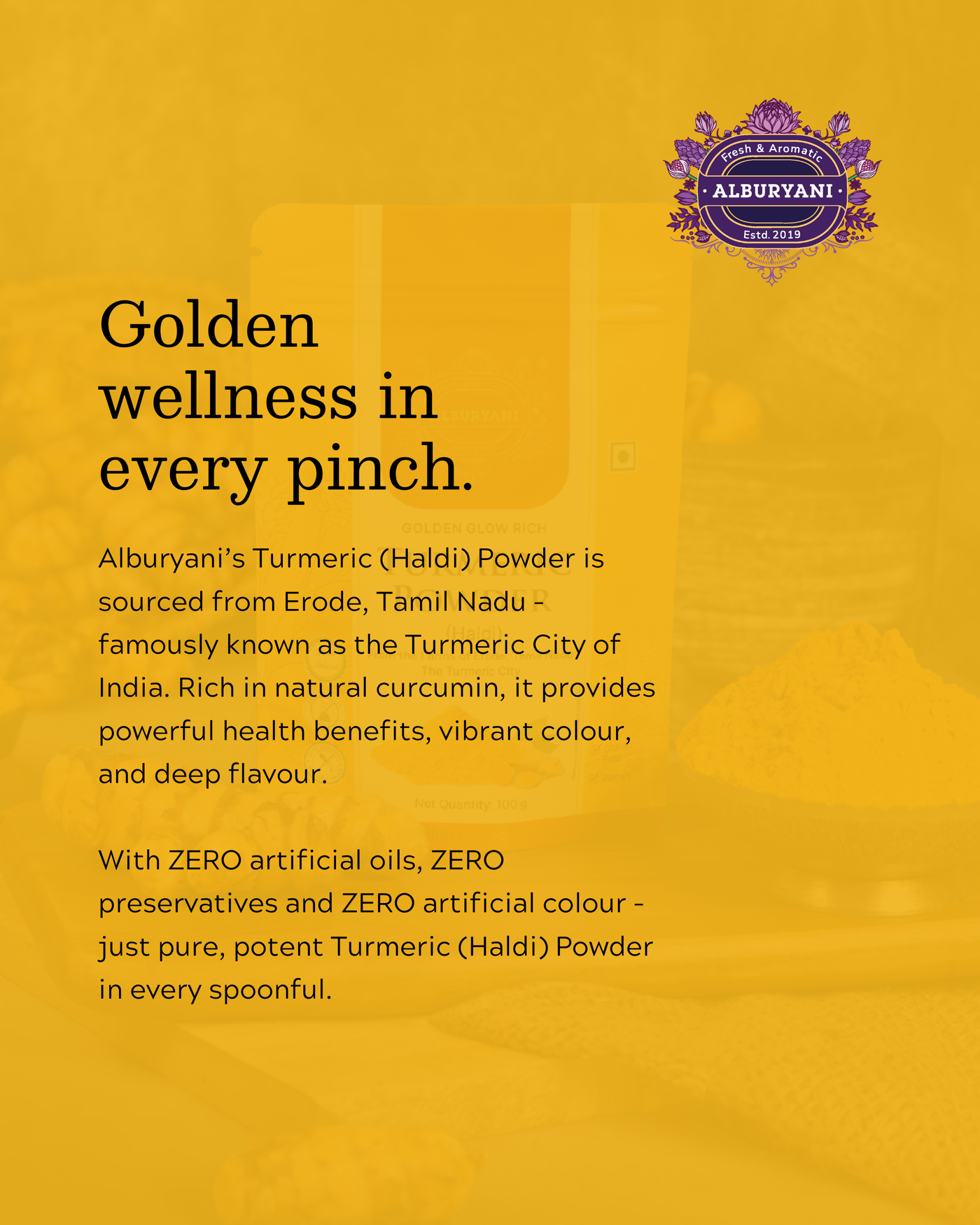 With ZERO artificial oils, ZERO preservatives and ZERO artificial colour – just pure, potent Turmeric (Haldi) Powder in every spoonful.