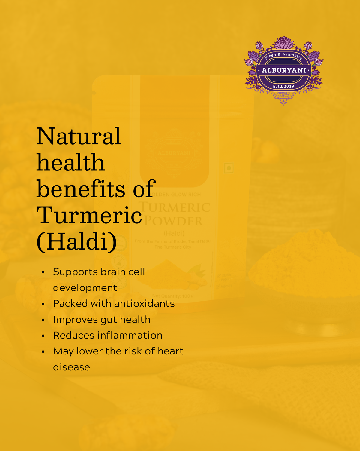 Alburyani’s Turmeric (Haldi) Powder is sourced from Erode, Tamil Nadu – famously known as the Turmeric City of India. Rich in natural curcumin, it provides powerful health benefits, vibrant colour, and deep flavour.