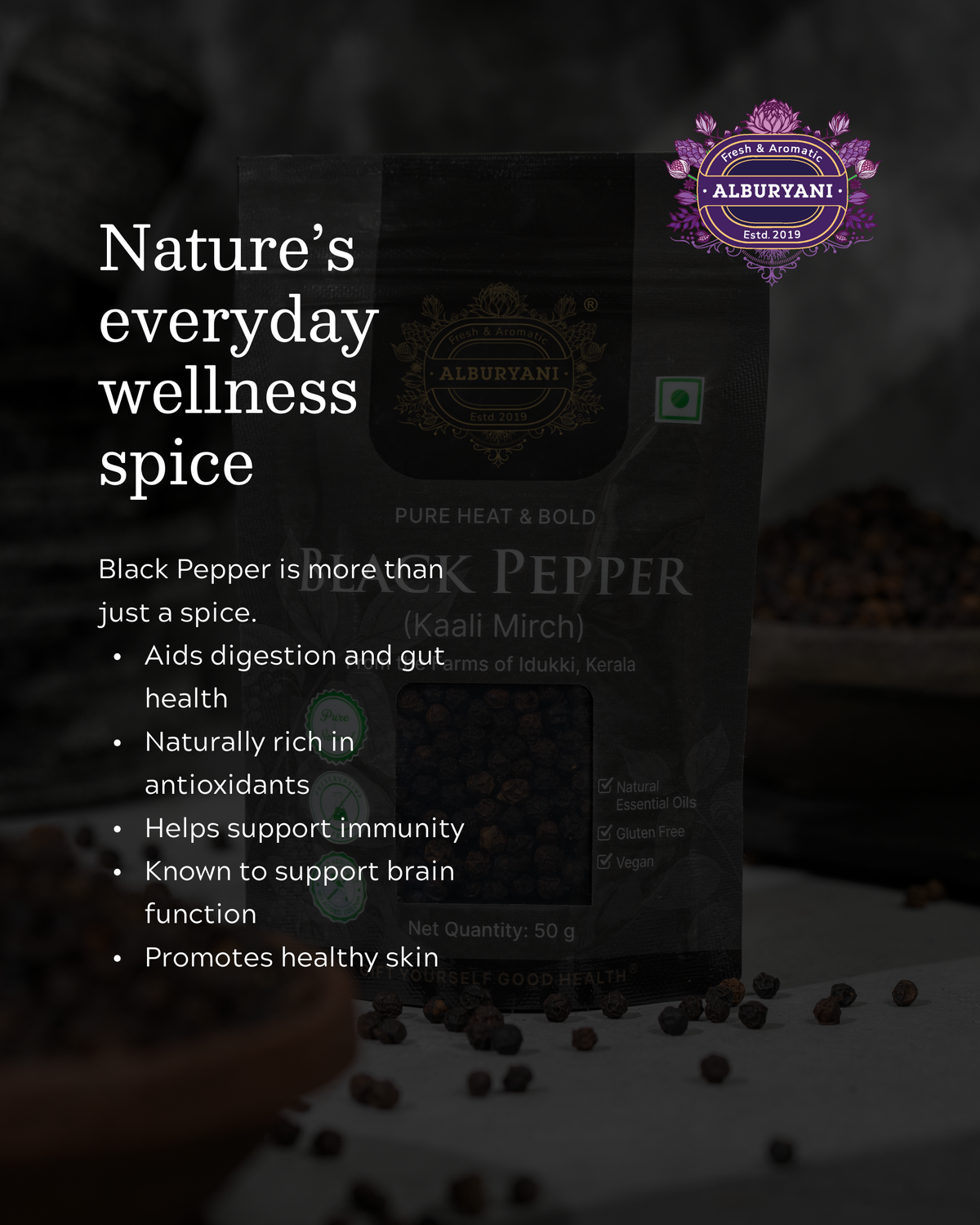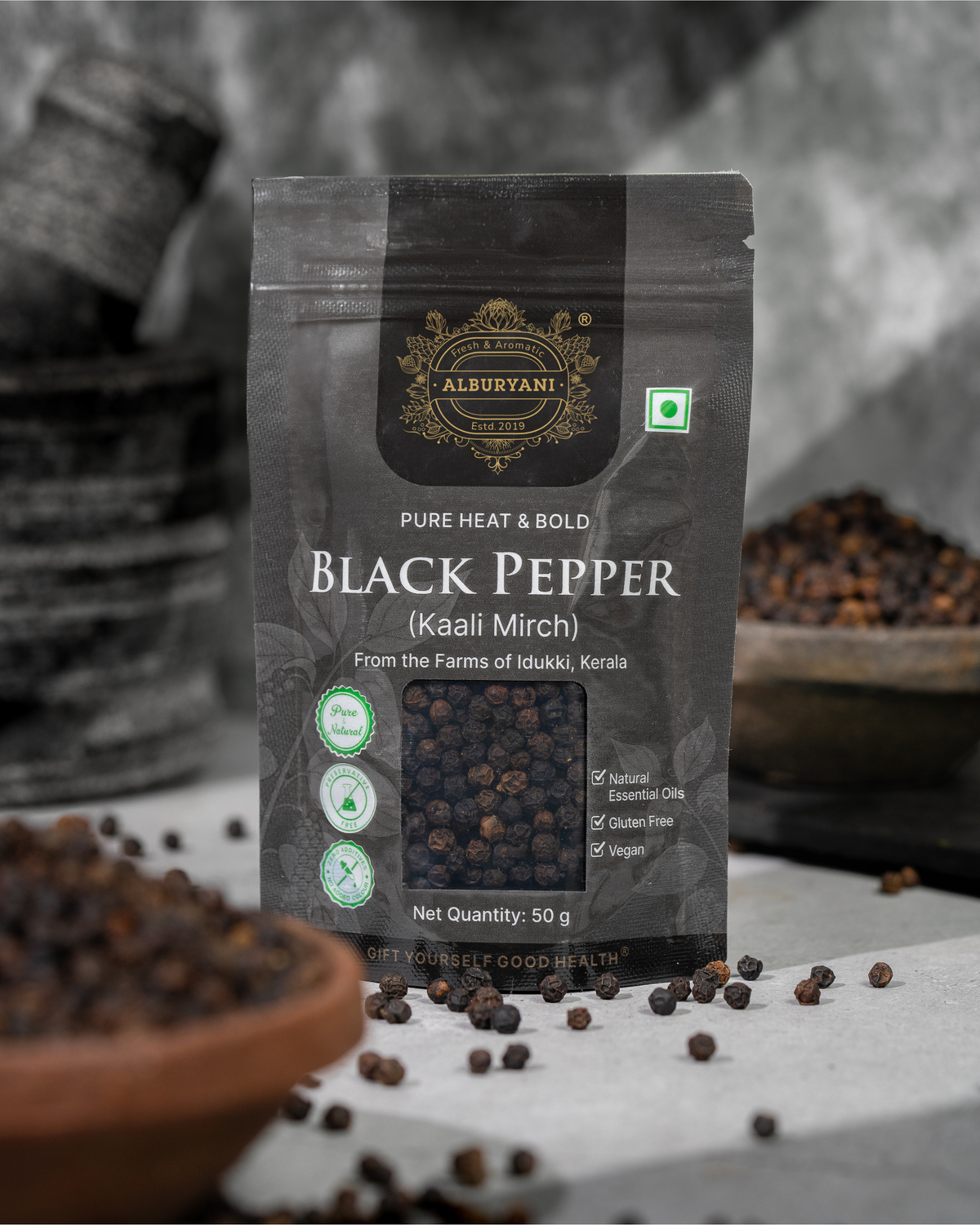 Alburyani’s Black Pepper (Kaali Mirch) is handpicked from the hills of Idukki, Kerala – India’s finest source of Black Pepper.